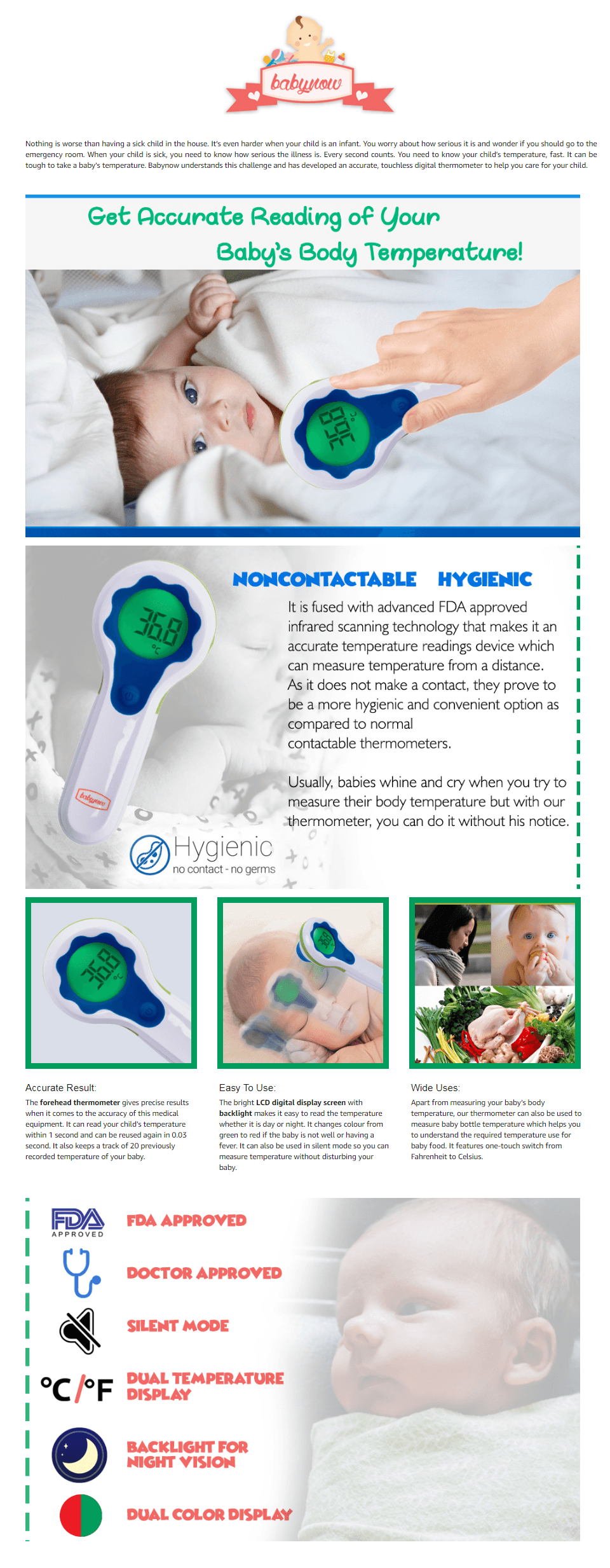 Babynow Digital Thermometers are fully FDA Approved and CE Rated. The digital LCD Dual Display of RED and GREEN will alert you when your temperature is outside normal levels. You can easily monitor fever in your family